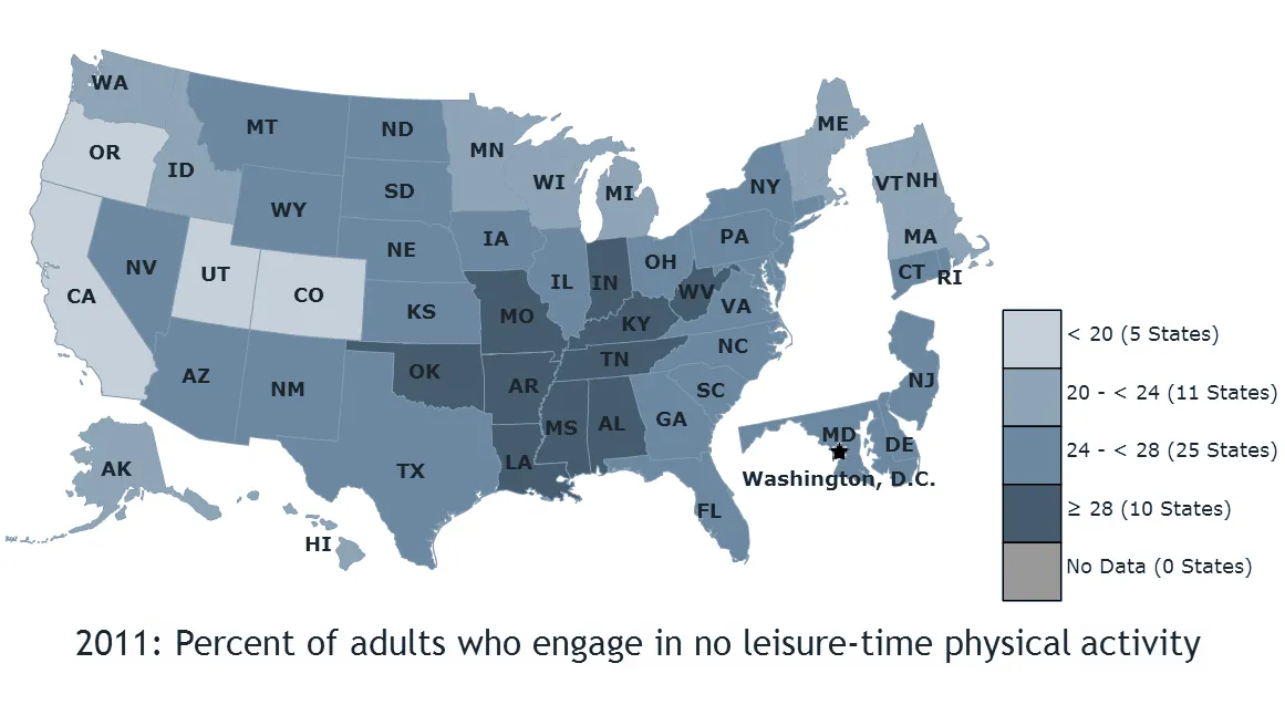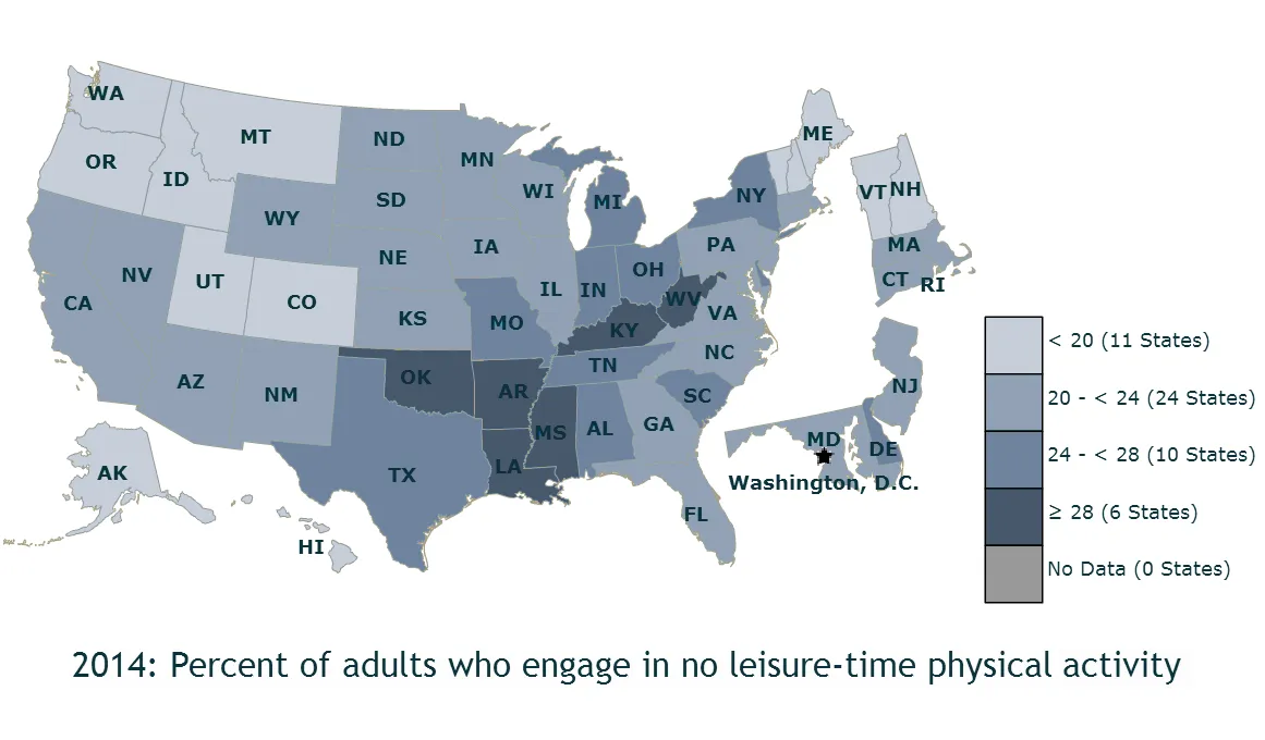 This shows a decrease in the number of people who don’t exercise around the country. As is noticeable, the 2011–2014 change is outstanding and right now there are even more people working on their sports habits than was shown in the last chart. Apparently, that is only the partial truth, as there is some more data to share: